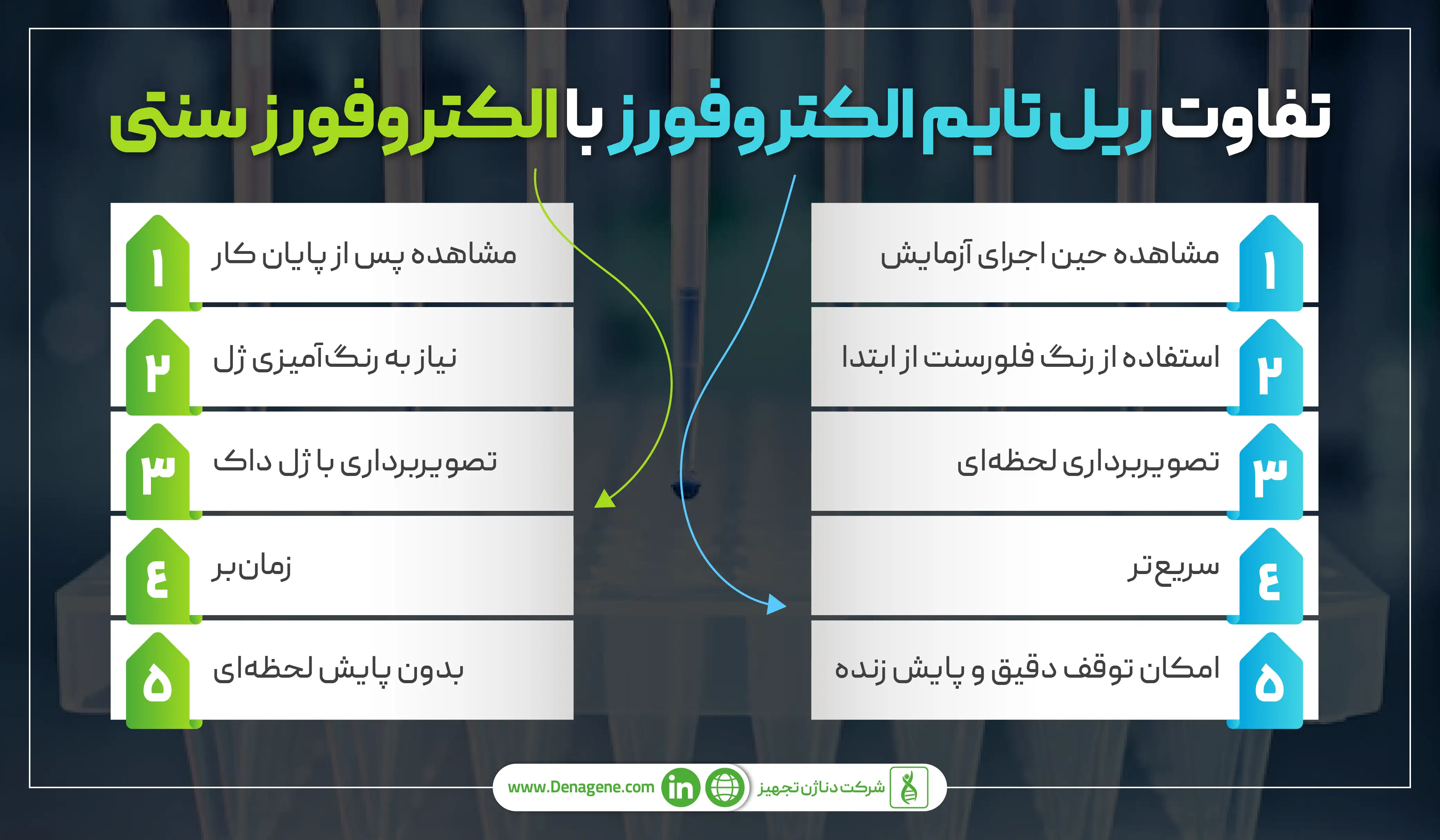 • کاهش زمان آزمایش: حذف مرحلهی رنگآمیزی و تصویربرداری پس از اتمام فرایند الکتروفورز.