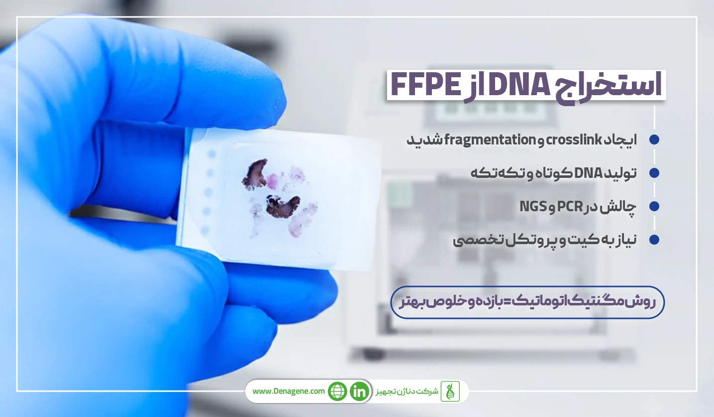 استخراج DNA از نمونههای FFPE (فرمالین فیکس شده و پارافین ایمبد) از دشوارترین انواع استخراج DNA است، زیرا فرآیند fixation (ثابتسازی) باعث ایجاد crosslink (پیوند متقاطع) بین پروتئینها و DNA و fragmentation شدید (تکهتکه شدن شدید) میشود. در نتیجه، DNA نهایی کوتاه و بخشبخش است و استفاده از آن در تستهای حساس مانند NGS (توالییابی نسل جدید) و توالییابی چالشبرانگیز خواهد بود.