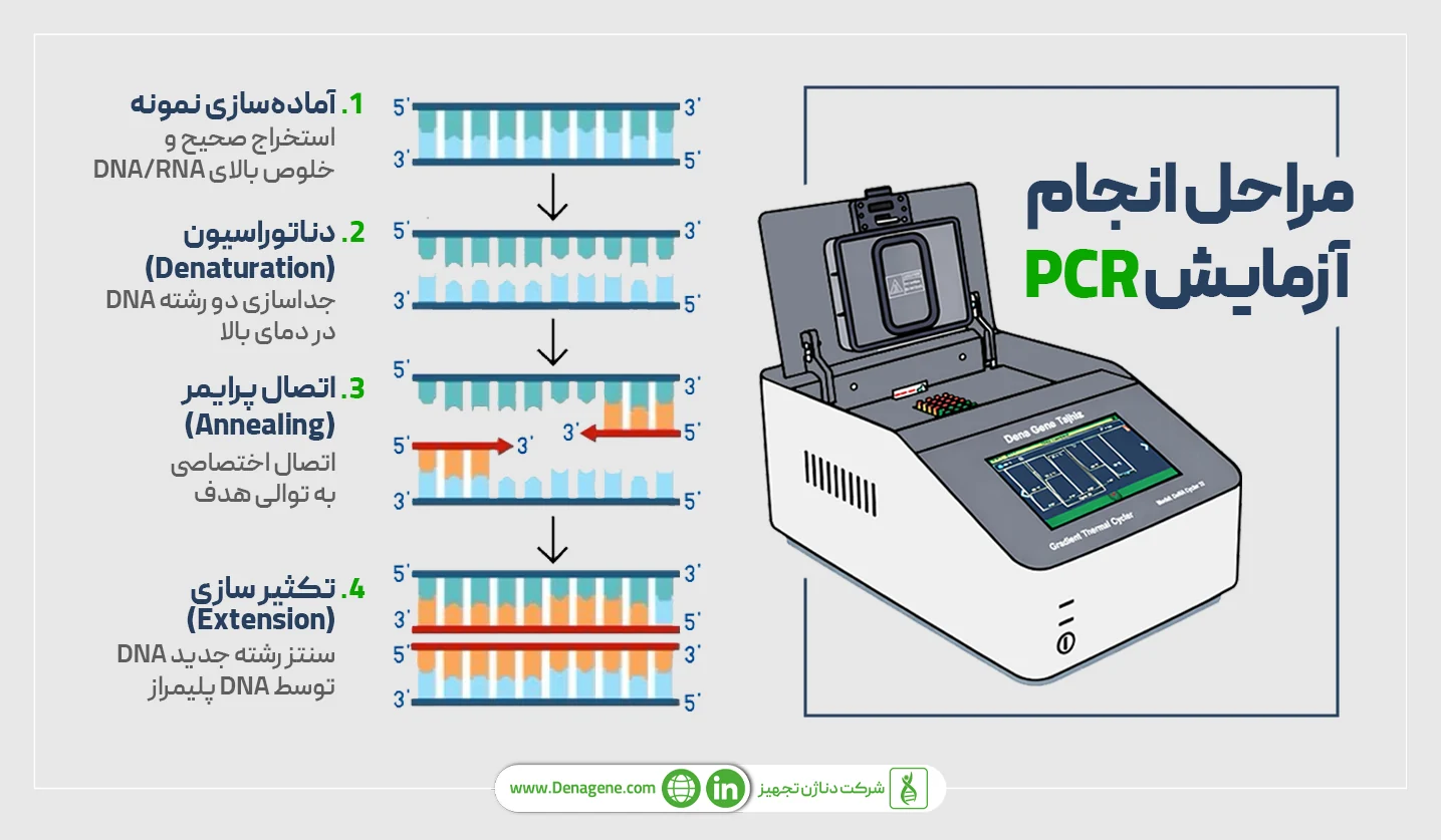 PCR (واکنش زنجیرهای پلیمراز) روشی دقیق برای شناسایی و تکثیر DNA یا RNA است. این آزمایش از مقدار بسیار کم ژنتیک، میلیونها نسخه تولید میکند که به آن «فتوکپی مولکولی» هم گفته میشود. واکنش PCR با آنزیم Taq polymerase انجام میشود و شامل چرخههای دناتوراسیون، اتصال پرایمر و تکثیر DNA است. دستگاه ترموسایکلر با کنترل دقیق دما، این چرخهها را بهصورت خودکار اجرا میکند و نتایج قابل اعتماد و تکرارپذیر ارائه میدهد.